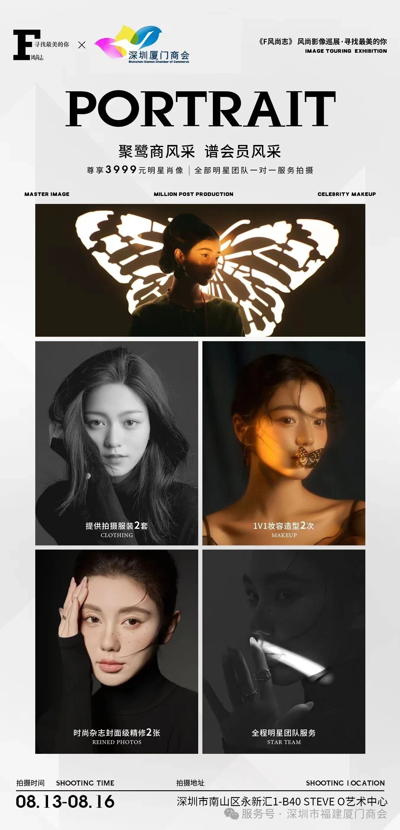 8月13-16日深圳厦门商会会员福利∶享价值3999元的风尚志杂志封面高级肖像定制套餐卡1张,含2套服装、2套妆造、2张精修照片。(加选300元/张)