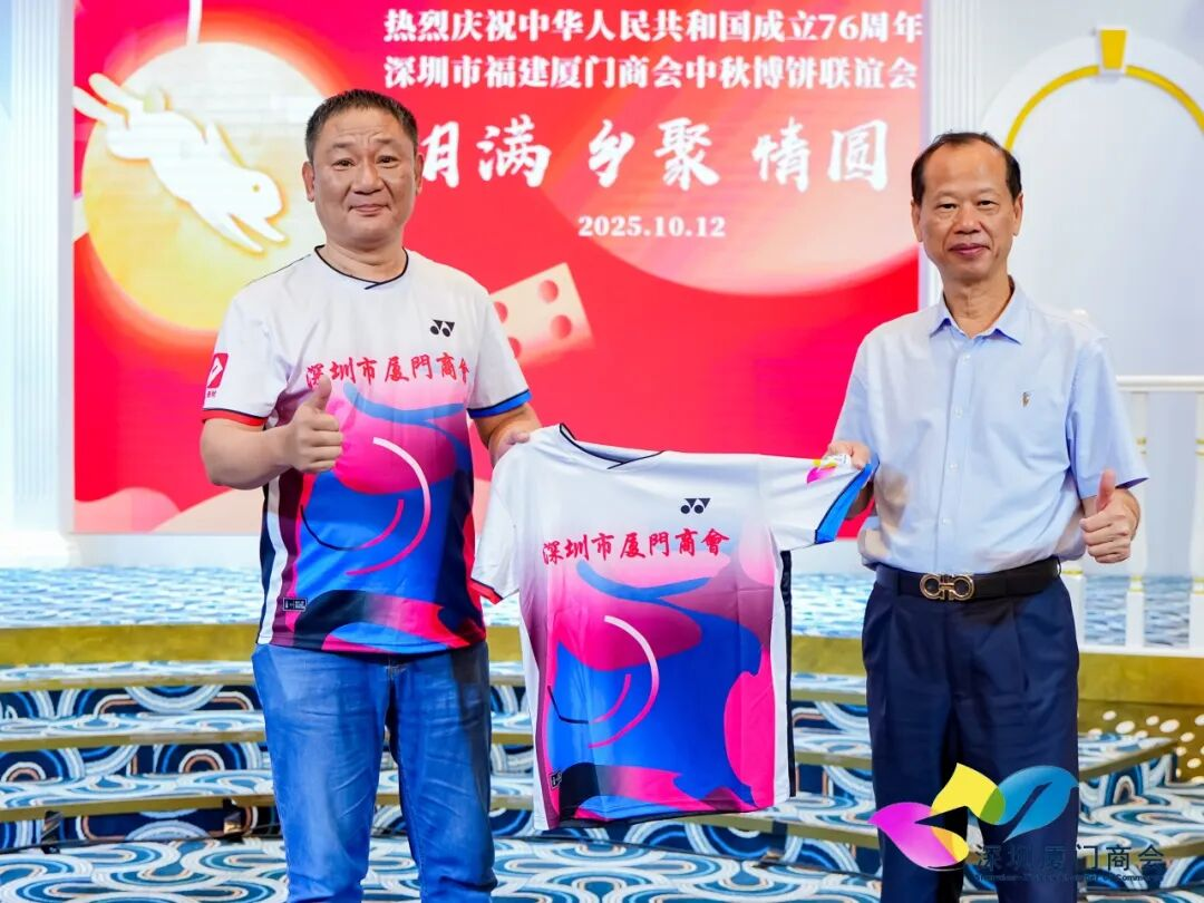 我会执行秘书长窦岩先生向创会会长、会长苏进展先生赠送由我会以及会员官炳坤先生赞助的深圳厦门羽毛球队的定制球衣。
