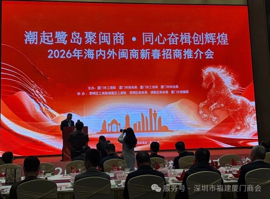 2026年2月24日下午,2026海内外闽商新春招商推介会在厦门隆重举行。本次推介会以“潮起鹭岛聚闽商·同心奋楫创辉煌”为主题,由厦门市工商联、市商务局、市工信局、市科技局联合主办,市轨道、马銮湾、临空、两金、机场和港口等重点指挥部及信息集团共同参与招商推介。我会执行会长兼秘书长黄丽红,名誉会长兼副会长洪伟艺等领导受邀出席本次盛会,与海内外闽商代表、政企各界人士齐聚一堂,共话乡情、共商合作、共谋发展。
